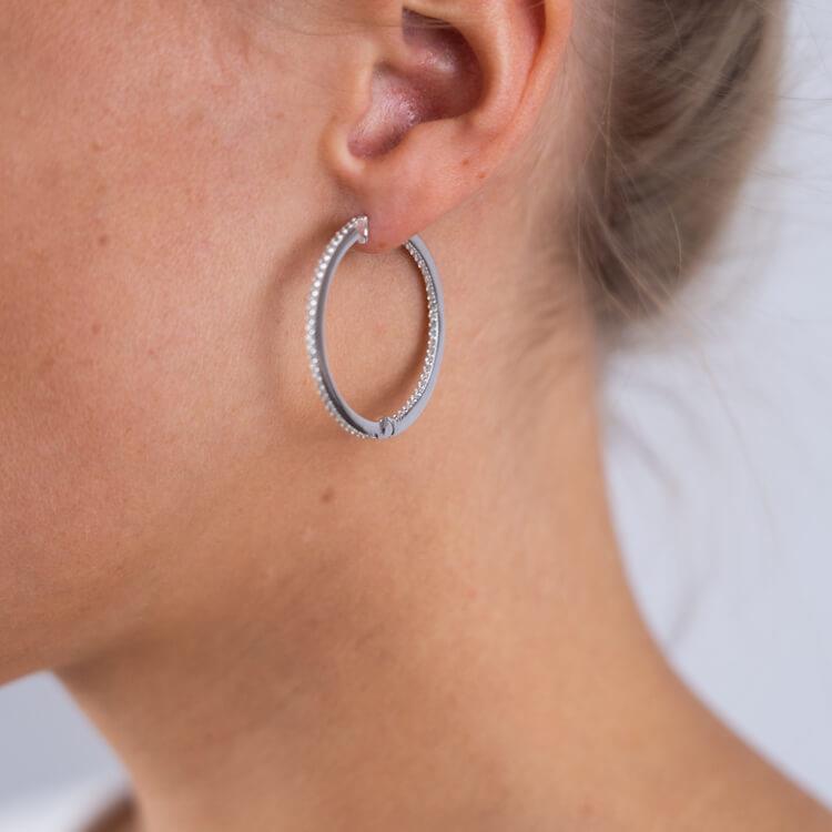 Silberne Creolen mit Steinbesatz / Rundum mit insgesamt 74 funkelnden Zirkonias sind die Creolen aus rhodiniertem Sterlingsilber verziert.