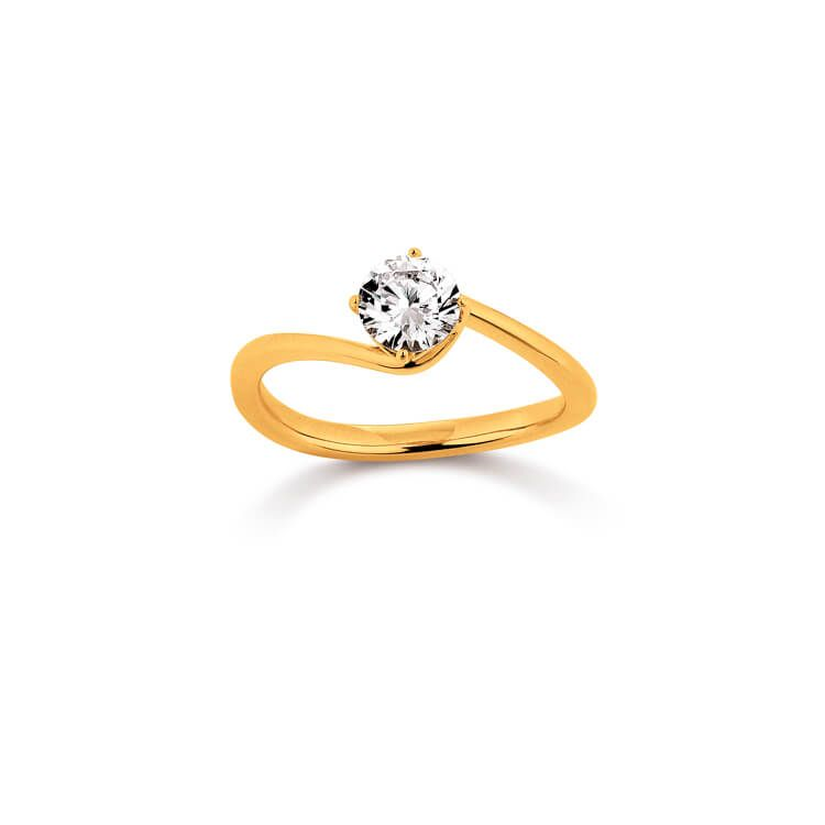 Solitaire-Ring / Die dynamische Form der Ringschiene verschafft dem zentral gefassten, 6 mm großen Zirkonia besondere Aufmerksamkeit. Aus gelb plattiertem Silber. Ein Solitaire-Anhänger und passende Ohrstecker ergänzen den eleganten Look.