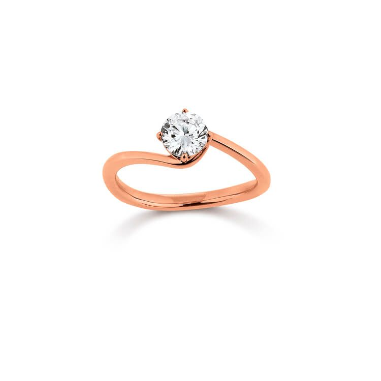Solitaire-Ring / Die dynamische Form der Ringschiene verschafft dem zentral gefassten, 6 mm großen Zirkonia besondere Aufmerksamkeit. Aus rosé plattiertem Silber. Ein Solitaire-Anhänger und passende Ohrstecker ergänzen den eleganten Look.