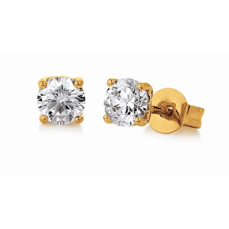 Ohrstecker mit Zirkonias / Durch die schlichte Krappenfassung bekommen die zentral gefassten, 5 mm großen Zirkonias eine besondere Aufmerksamkeit. Aus gelb plattiertem Silber. Ein Solitaire-Ring und ein passender Anhänger ergänzen den eleganten Look.